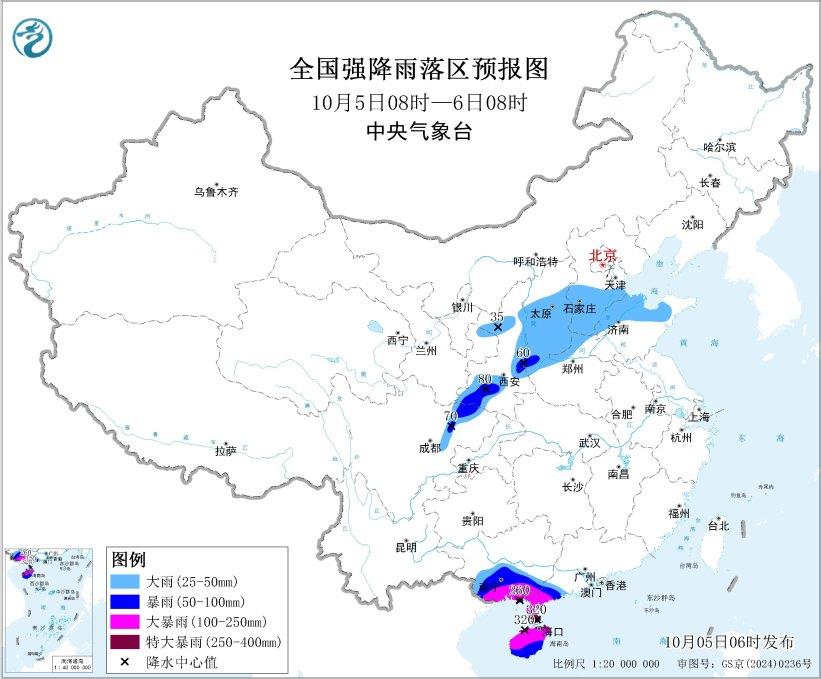 降水预报:10月5日8时至6日8时,海南岛大部、广东西南部、广西南部等地部分地区有暴雨到大暴雨,局地特大暴雨(250~320毫米)。