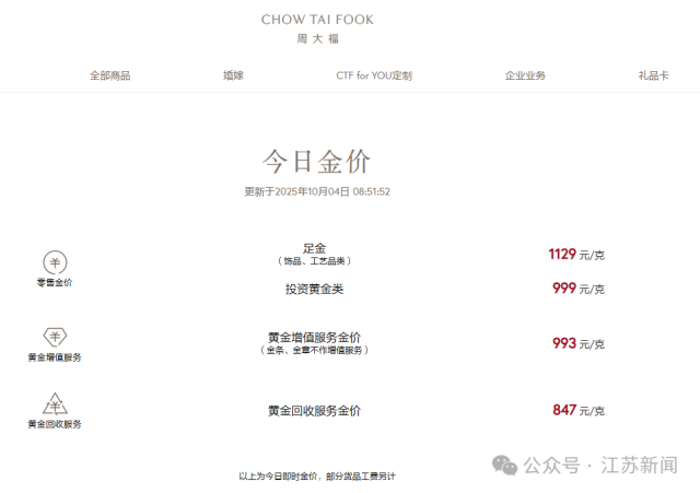 与此同时,10月4日,国内多个金饰品牌金饰克价再创新高。