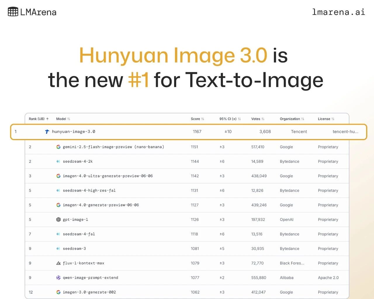 国庆假期过半,大厂们的AI争霸赛并未因假期停歇。今日,腾讯宣布,其发布仅一周的混元图像3.0,在文生图领域的“权威竞技场”LMArena中,从全球26个大模型里突围,登顶第一,成为目前效果最好的开源生图模型,效果可对标业界头部闭源模型。腾讯混元团队透露,混元图像3.0目前的版本仅开放了文生图能力,图生图、图像编辑、多轮交互等版本将于后续发布。详情>>