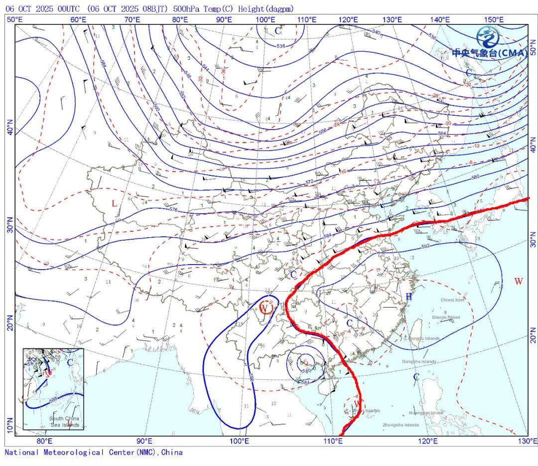 今天,副热带高压控制着南方大部地区,图中画红线部分为副热带高压大致位置。