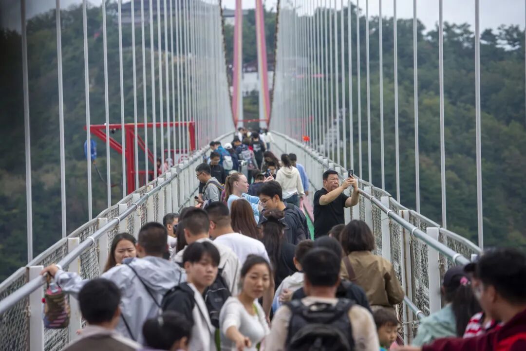 • 天蒙景区:秋日山水魅力尽显,悬空玻璃栈道上挤满了打卡的游客,山间红叶与云海交织的美景,成了游客镜头里的绝佳素材。
