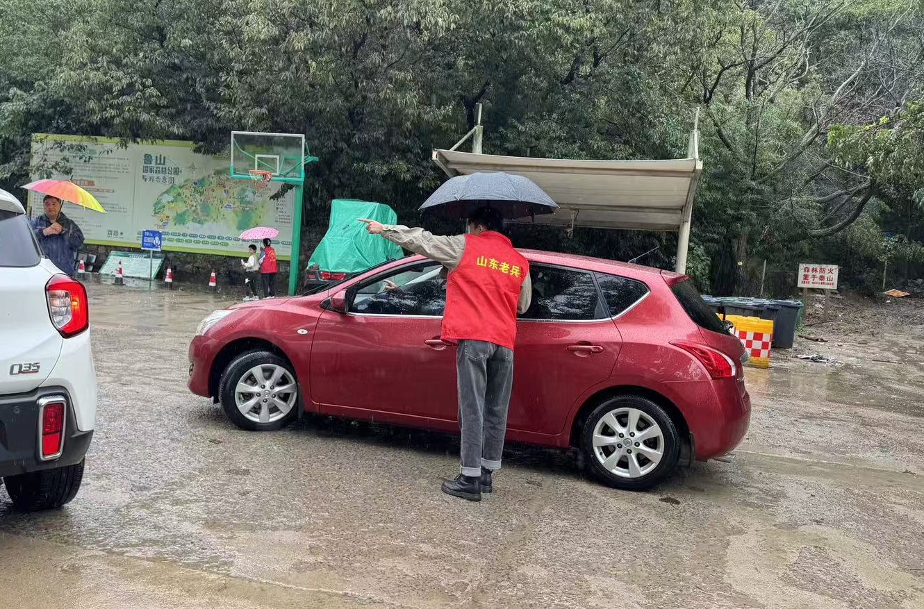 青山为幕,红马甲是最鲜活的点缀——雨天的鲁山国家森林公园入口,一名志愿者正撑着伞半弓身子,向车主指引停车方向,雨水顺着伞沿滑落,洇湿了裤腿,可他扬起的笑容却格外清亮:“您好,鲁山景区入口请直行,停车场在右侧岔路!”