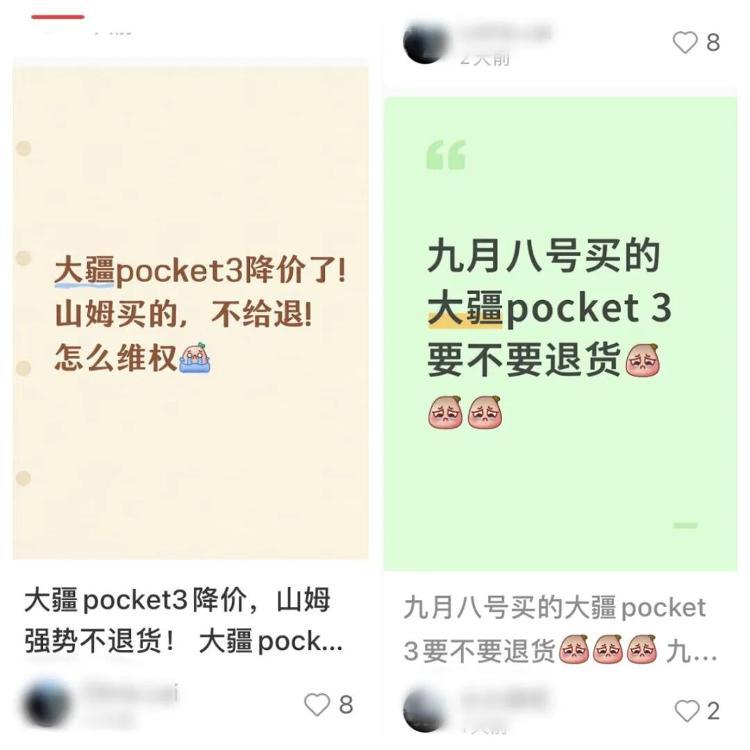 另外,一位网友告诉记者,她是10月3日原价购买的Pocket3相机,得知降价的消息后心情低落,“早知道先不买了。”