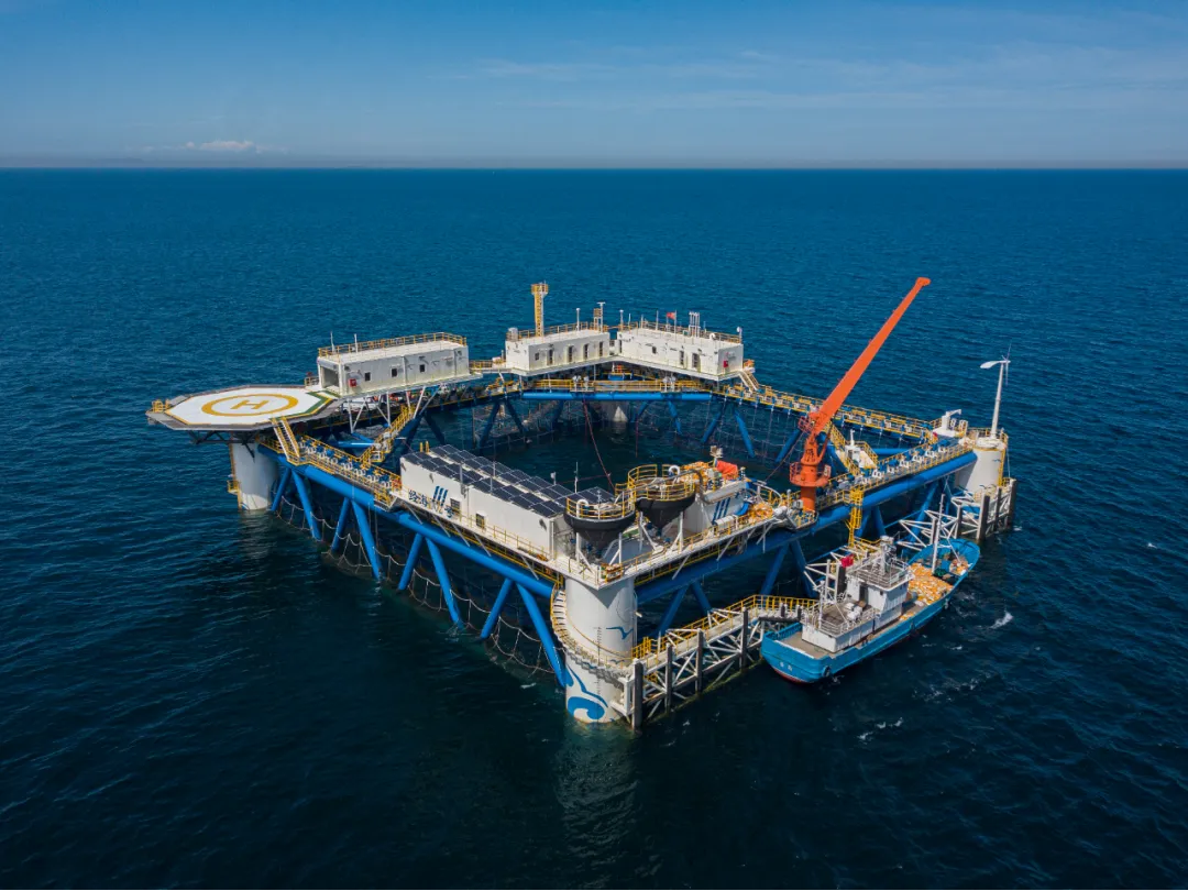 万顷碧波,海天相连。在烟台南隍城岛海域,由中集来福士集团打造的亚洲最大量产型深海智能网箱平台——“经海001-008号”如一个个“海中城堡”,囤起一座座“蓝色粮仓”。