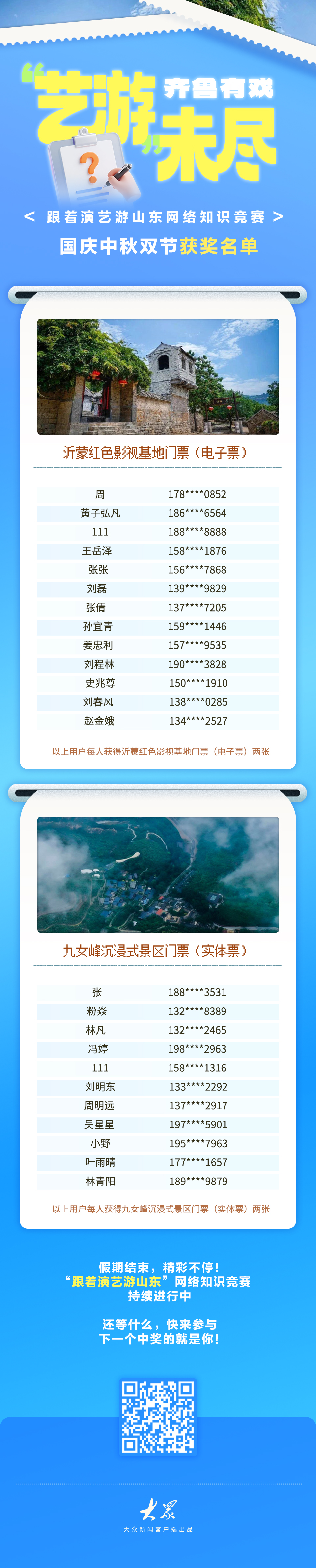 齐鲁有戏 “艺游”未尽!跟着演艺游山东网络知识竞赛双节获奖名单来啦来源:大众新闻2025-10-09 16:15:40原创责任编辑:许光宇大众新闻原创内容,未经授权不得转载转载事宜请联系大众新媒体大平台 联系电话:0531-85193469