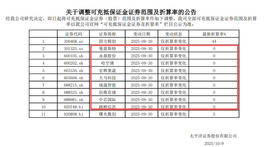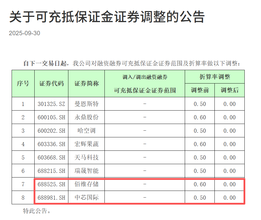 国泰海通与太平洋证券:10月9日,两家券商同步公告显示,其中将9家上市公司股票折算率调整为0,中芯国际、佰维存储同样位列其中,其余7家公司为曼恩斯特、永鼎股份、哈空调、宏辉果蔬、天马科技、瑞晟智能、路桥信息。