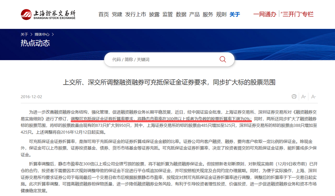2016年12月2日,沪深两地交易所公告称,经证监会批准,近日沪深交易所对《融资融券交易实施细则》进行修订,其中,调整可充抵保证金证券折算率要求,将静态市盈率在300倍以上或者为负数的股票折算率下调为0%。