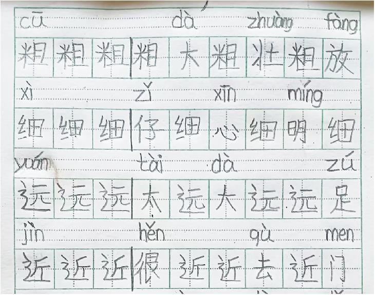 程杰会一条条批改,用红色的字标注:“‘家’字的宝盖头要写得宽一点,把下面的‘豕’盖住,就像房子保护家人一样。”