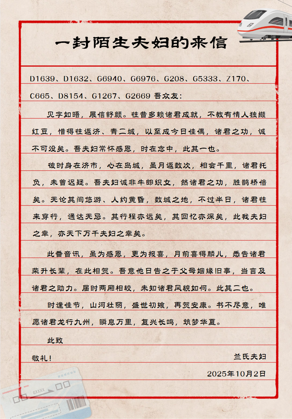 彼时身在济市,心在岛城,虽月返数次,相会千里,诸君托负,未曾迟疑。吾夫妇诚非牛郎织女,然诸君之功,胜鹊桥倍矣。无论其间悠游、人约黄昏,数城之地,不过半日,诸君往来穿行,通达无忌。其行程亦远矣,其回忆亦深矣,此我夫妇之幸,亦天下万千夫妇之幸矣。