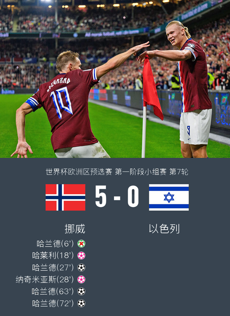 最终,凭借哈兰德的帽子戏法,挪威5-0战胜以色列。