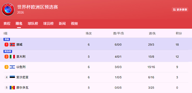 挪威除了全取3分之外,又把净胜球扩大到26个。按照世预赛规则,小组第一将直通世界杯,而挪威最大的对手意大利即便将来和挪威同分,也很难实现超越了。