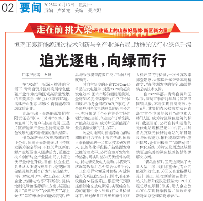 自2022年落户青岛自贸片区以来,恒瑞正泰新能源与片区发展同频共振,不断实现自身突破。今年6月,其集团办公楼成功获评青岛市首个中国船级社“碳中和大楼”认证,成为片区绿色建筑的标杆;截至目前,公司自持和运维的光伏电站规模已超200兆瓦,并具备兆瓦级光伏储能电站的项目建设与运营能力。依托能源数智化应用优势,企业积极推广“源网荷储”一体化系统,为片区及周边区域提供更加完善的绿色低碳智慧能源解决方案。