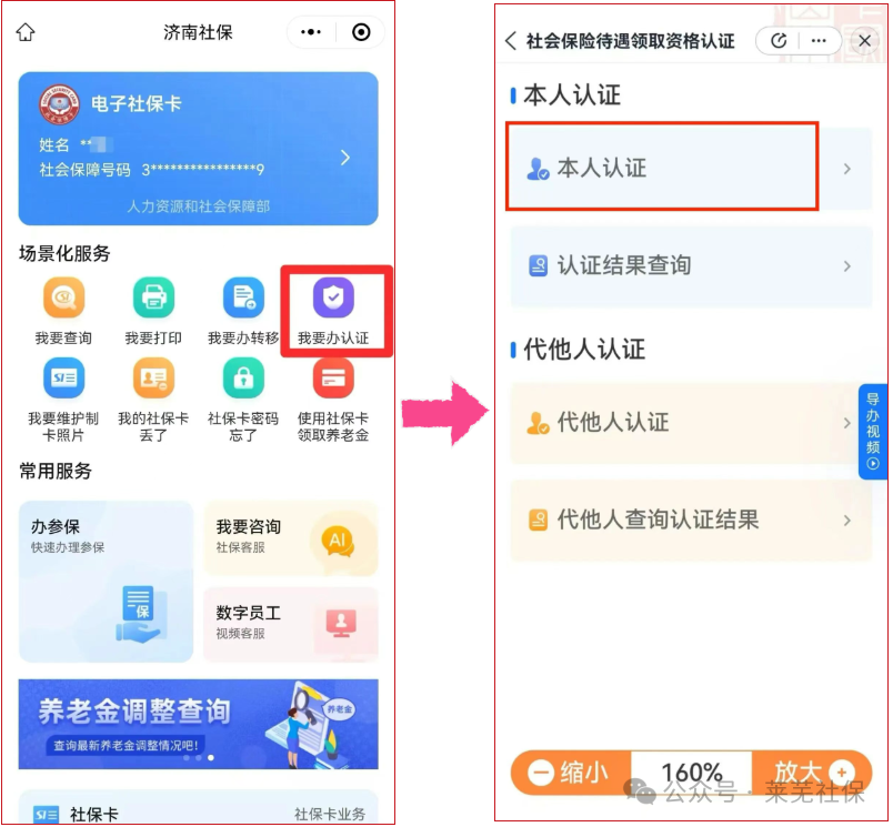 或在微信搜索“济南社保”公众号,点击下方“办社保”,找到“我要办认证”按键,进入认证界面后点击“本人认证”,按提示进行人脸识别认证即可。