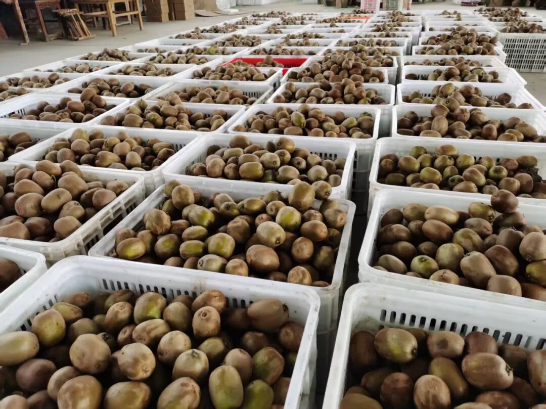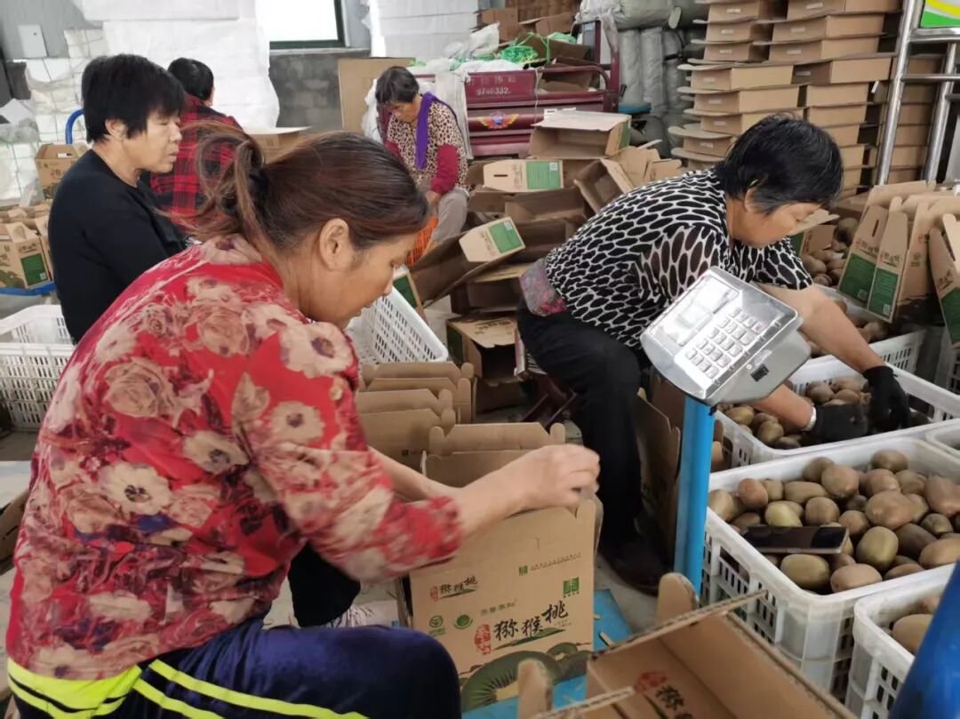 在大刘村的猕猴桃打包车间里,不少工人正在现场分拣、装箱、称重、打包,现场一片忙碌。