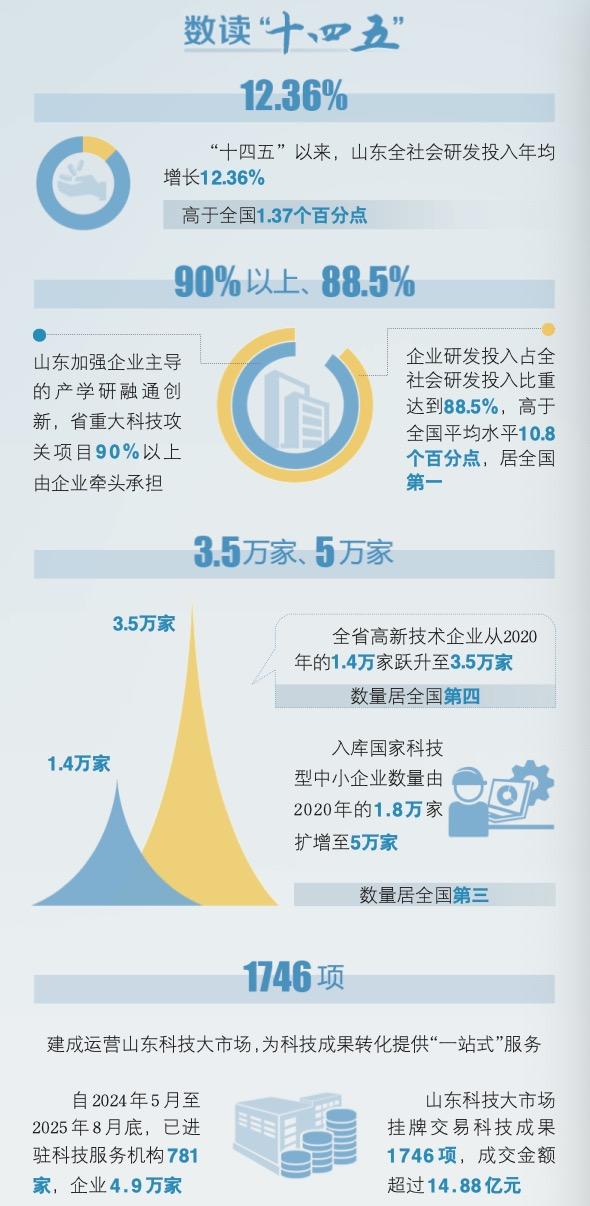 增加高质量科技供给、强化企业科技创新主体地位、促进科技成果转化应用……“十四五”以来,山东推出一系列政策举措,全面深化科技体制机制改革,推进科技创新与产业创新深度融合,全力打造在全国有重要影响力的科技创新中心和创新策源地。