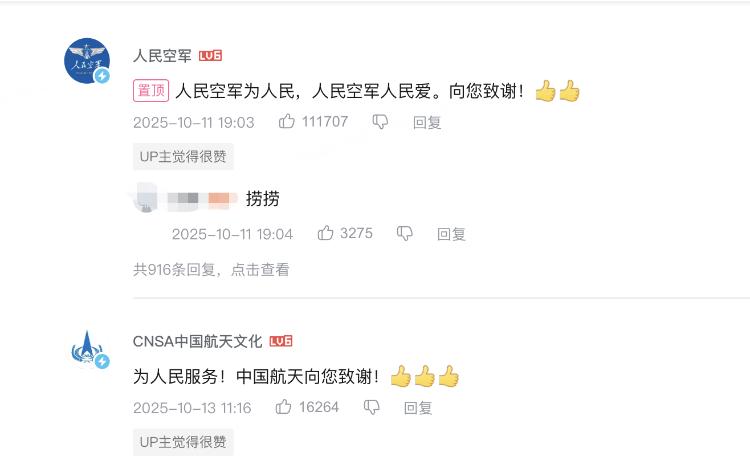 上游新闻记者注意到,中国国家航天局官方号“CNSA中国航天文化”也在视频下留言:“为人民服务!中国航天向您致谢!”