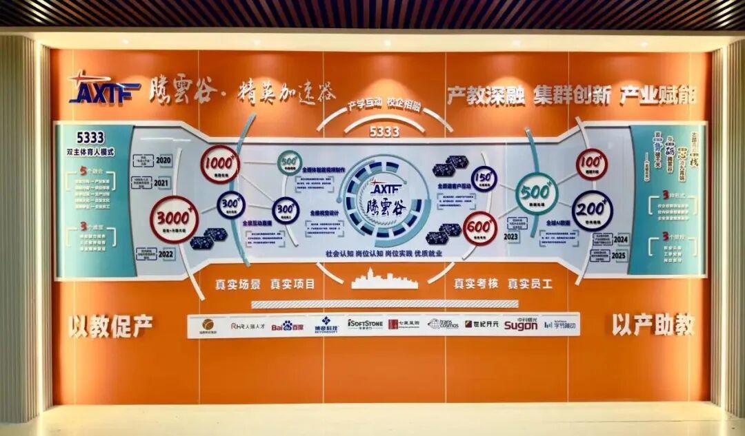 产业驱动方面,校企共同打造“双轮联动”实践平台。校内,滨海迅腾集团建设“腾雲谷-精英加速器”这一“校中厂”,完全参照企业生产标准复刻真实产业环境,承接并交付企业真实项目。学生以“准员工”身份参与项目开发,按工作绩效获取学分,实现“教学做合一”。校外,迅腾集团依托三家数字产业子公司及生态企业构建“厂中校”,实施“招生即招工”现代学徒制,定向培养并接收学生实习就业。数据显示,定向班毕业生入职留存率持续攀升,不少学生成长为企业管理骨干。通过“校中厂”的真实产业环境、项目实践、员工化管理与考核,学生在校期间即可深度体验职场文化,实现从“学生”到“准员工”的角色无缝转变。