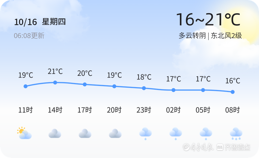 今天是10月16日,星期四,农历八月廿五。菏泽市今天天气多云转阴,气温在16℃至21℃之间,东北风2级,空气湿度为95%。目前气温为15.1℃,市民外出需注意适时添衣。各区天气状况一致,均为多云转阴,温度变化不大,整体天气较为平稳。