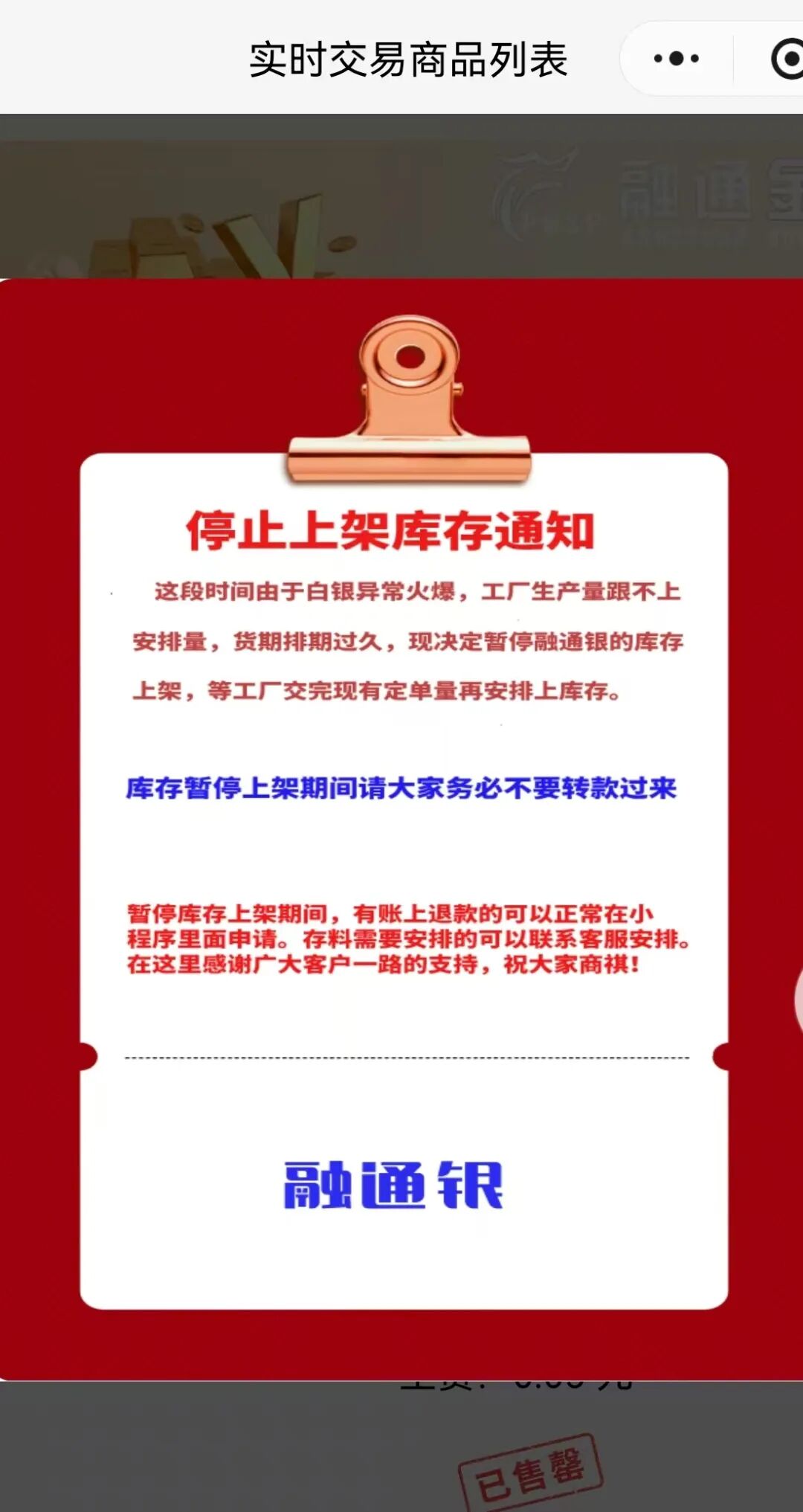 她告诉记者,由于白银销售火爆,工厂生产量无法跟上,在白银实时销售小程序“融通银”中,目前发布停止上架库存的公告。
