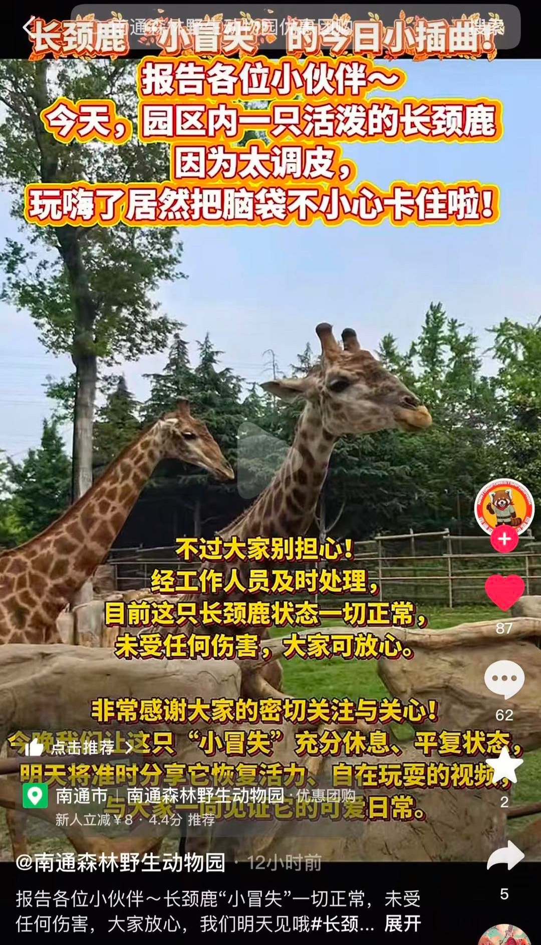 记者查询到,南通森林野生动物园在15日晚10点左右发布一则视频,视频称经工作人员及时处理,目前这只长颈鹿状态一切正常,未受到任何伤害,明日(16日)将准时分享它恢复活力、自在玩耍的视频,与大家一同见证它的可爱日常。