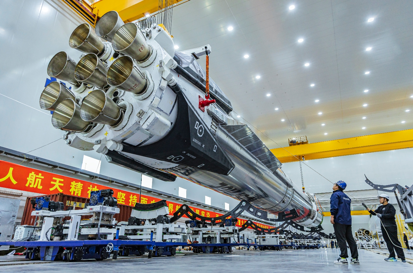 该型火箭采用不锈钢作为箭体主结构材料,一子级配备九台天鹊-12A液氧甲烷发动机,并安装了子级回收所需的栅格舵和着陆支腿等,可在执行轨道发射任务后自主高精度返回,在回收场实现软着陆并重复使用。
