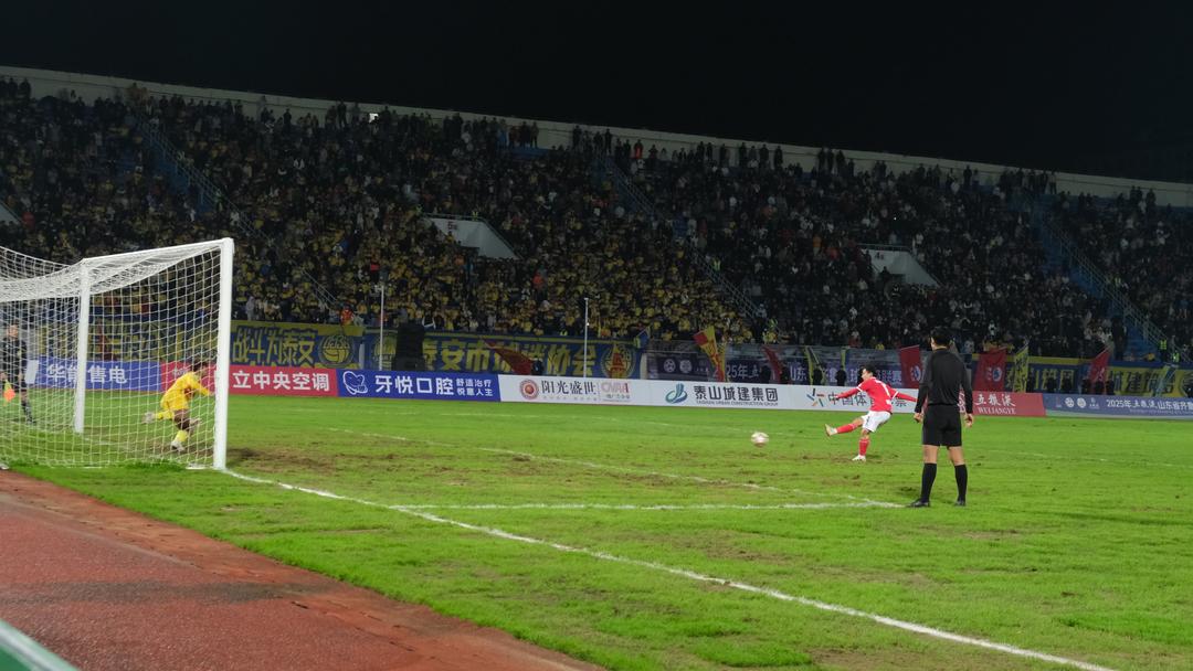 泰安泰山城建和菏泽曹州队,19日晚在泰山体育中心球场上演点球大战。