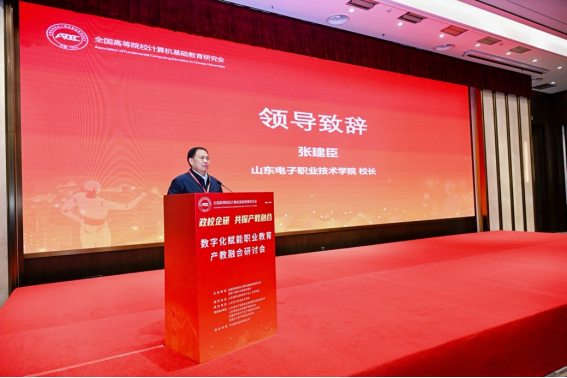 山东电子职业技术学院校长张建臣校长致欢迎辞,介绍了山东电子职业技术学院在产教融合领域的实践成果。代表承办方承诺,将落实会议共识,深化与专委会及各方的协同合作。