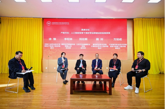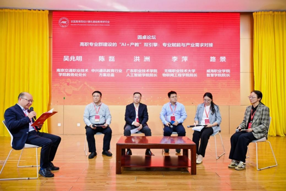 两场圆桌论坛聚焦高职专业群建设核心议题。江苏食品药品职业技术学院党委副书记安进主持 “高职专业群建设的‘AI + 产教’双引擎:专业赋能与产业需求对接” 论坛,南京交通职业技术学院教务处处长吴兆明、中兴通讯教育行业总监陈磊、广东职业技术学院人工智能学院院长洪洲、无锡职业技术大学物联网工程学院院长李萍、威海职业学院智慧学院院长路景等 5 位嘉宾,围绕专业群与产业需求对接、数字化资源共建等展开讨论,提出 “AI +专业” 赋能的创新思路。