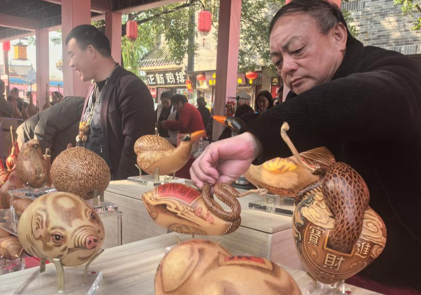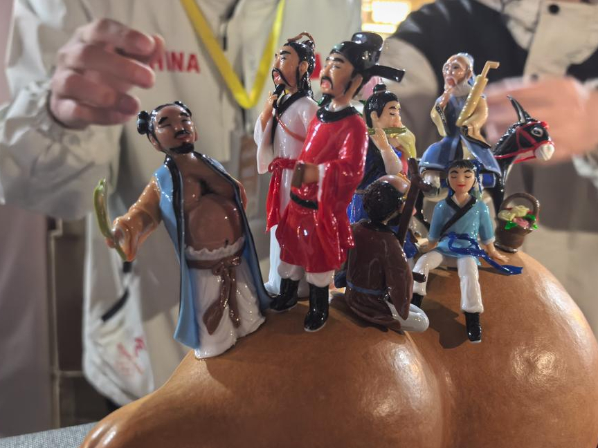 葫芦也给人带去了生活的希望。在精品葫芦展区,听障人士孟丹丹制作的一款八仙过海主题的葫芦面塑,将葫芦与面塑相结合,“八仙”表情生动细腻,令人叹为观止。她还将小八宝葫芦与面塑、醒狮有机融合,一个个制作精良的小葫芦作品被抢购一空。“儿媳妇曾多次在各种比赛中荣获奖项,但是销路一直没打开,原本打算的是葫芦节过后去南方电子厂打工,没想到这次葫芦节上,有一百多位葫芦爱好者、同行、客商加微信好友,想长期供货,如果能形成长期稳定的订单,在家门口创业,她就不用去外地打工了。”孟丹丹的公公杜玉禄说。