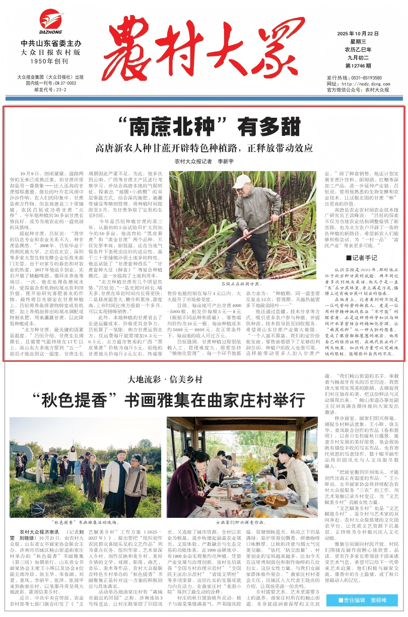 在他身上,记者看到的不仅是一位吃苦耐劳的新农人,更是一位用科学精神挑战农业“不可能”的探索者。正是这种将科学知识与田间汗水紧密结合的精细化管理,让“南蔗北种”从一种大胆的想象,变成了眼前郁郁葱葱的现实。他用自己的经历证明,在现代农业的广阔天地里,知识的力量可以突破地域的限制、能够弥补自然的不足。
