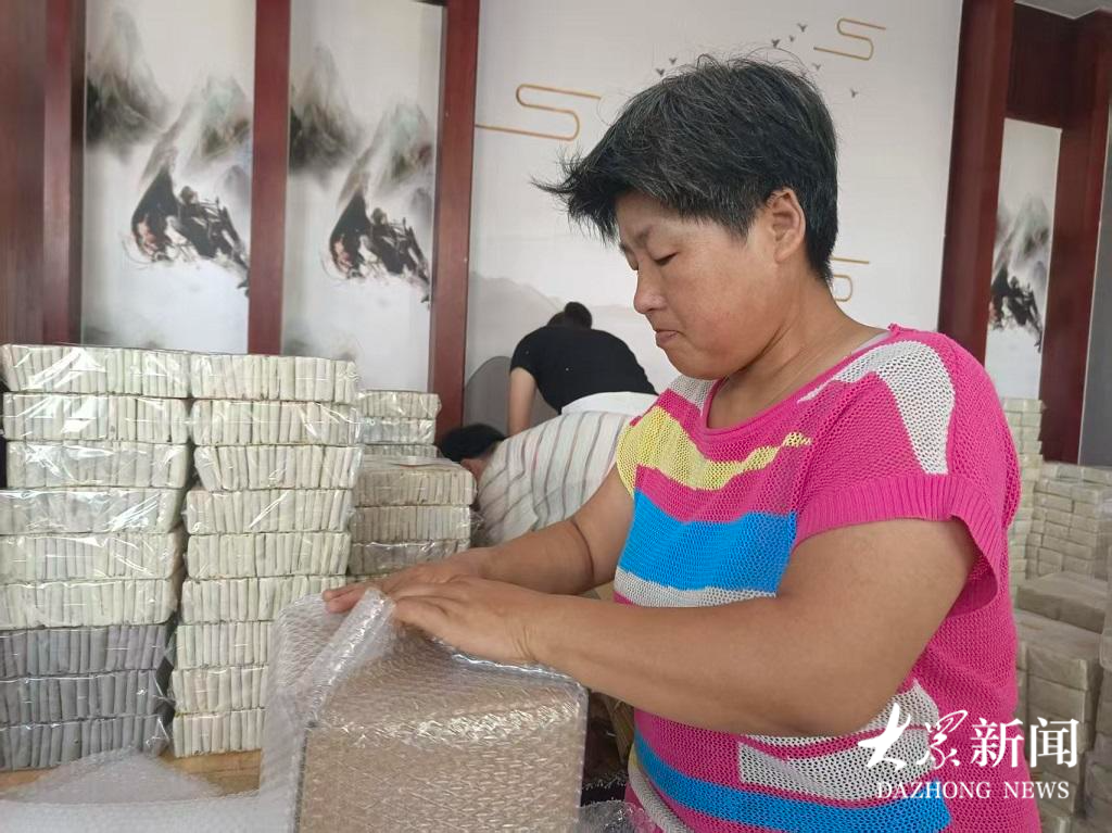 如今,黄伟的煎饼厂一年要用掉60万斤面粉,全部来自王庄镇及周边的种粮大户。2018年,他又创新推出“公司+庭院”模式:把村里闲置的庭院改造成加工点,公司提供面粉、鏊子和技术,妇女们在家门口烙煎饼,按斤计酬。“现在村里有12个庭院加工点,百余名妇女跟着我干,一个月能赚3000多块,还不耽误照顾老人孩子。”黄伟指着庭院里正在干活的村民张桂兰说,“桂兰之前在家没收入,现在既能赚钱,又能看着孙子上学。”