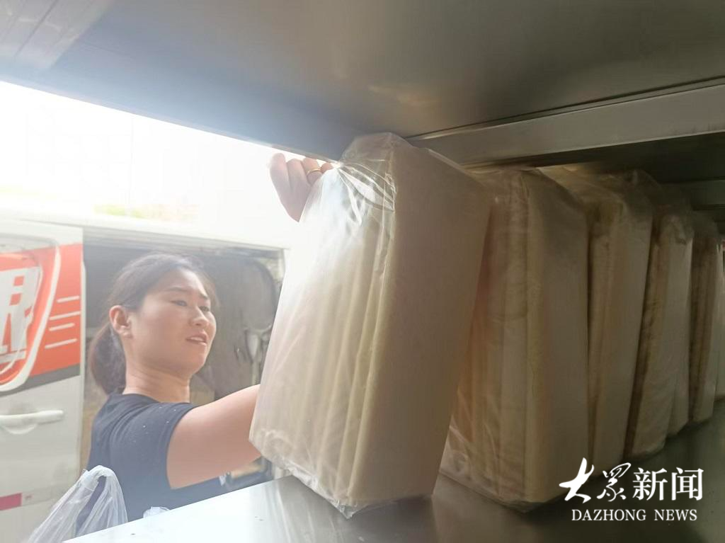 村民正在把打包好的煎饼装上物流车。