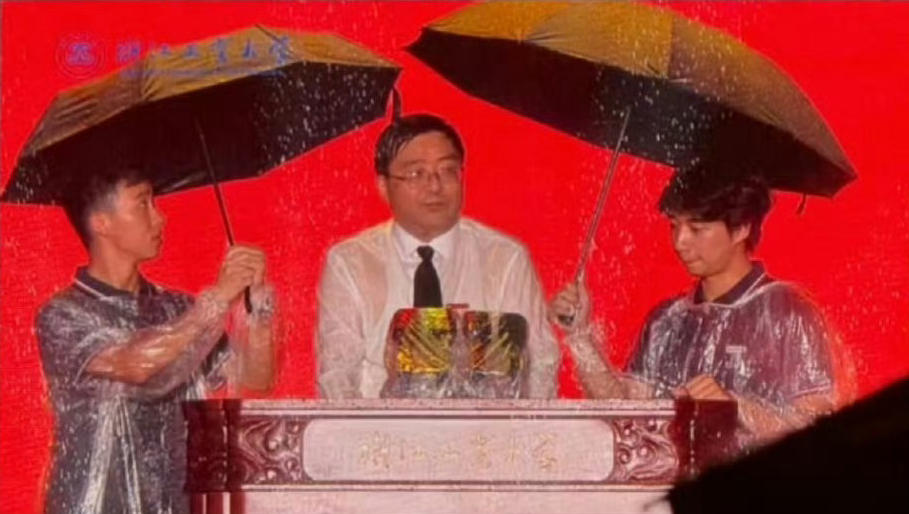 9月3日晚,浙江工业大学举行2025级本科生开学典礼,没想到天降大雨,高翔拒绝了雨衣,冒雨致辞,两名新生自发上台为校长打伞,没想到因为默契不够,导致雨水恰好从雨伞中间缝隙流下,将高翔“浇透”。这个画面被网友戏称为“双一流”。