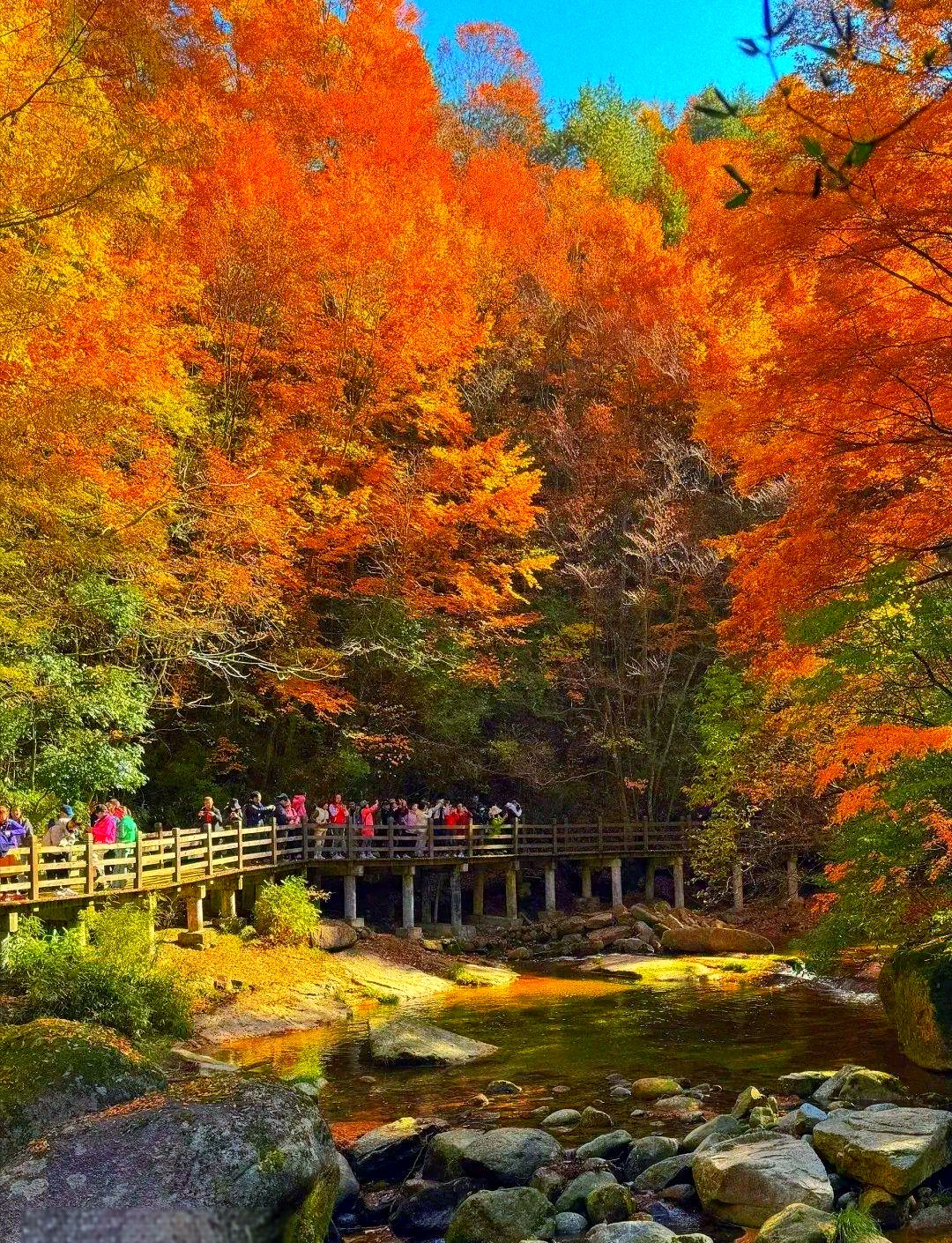 在各地红叶即将落幕的时候,广州韶关森林国家公园的红叶才刚刚登场,预计12月初将进入最佳观赏期。在南岭,由于海拔落差大,植被类型多样,每年秋天会形成“五彩秋色”的壮丽景观,这里不仅有三角枫、枫香树、山乌桕等红叶树种,还分布着银杏、鹅掌楸等黄叶树种,深秋时节,仿若大自然打翻了调色盘。此外,这里水资源丰富,有“瀑布群”、“亲水谷”等特色红叶观赏地,红叶与溪水、瀑布搭配,可以带来“水映丹枫”的观赏体验。