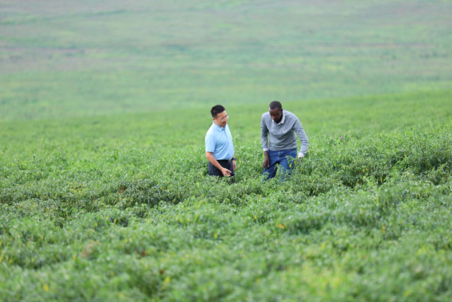2025年5月22日,在卢旺达加绍拉农场,湘农国际非洲商务代表与当地农业技术员查看辣椒长势。