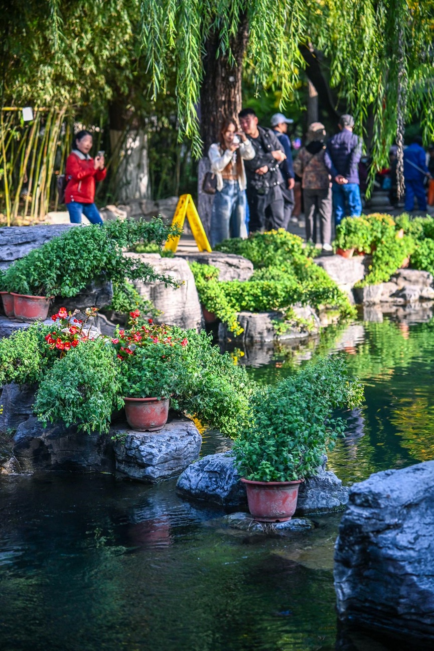位于趵突泉东门入口及龟石广场,菊花小景巧妙结合传统造园技艺与现代设计理念,在古韵盎然的庭院廊榭间,布置精巧雅致的菊艺小品,展现新时代的传承与创新。