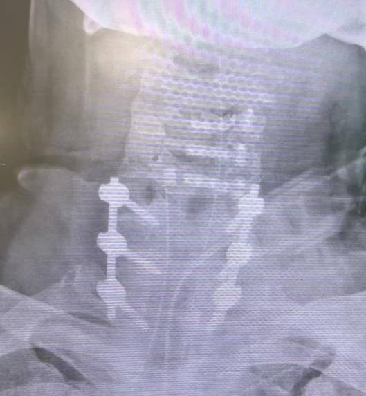 据悉,该患者在使用射钉枪作业时不慎发生意外,一枚高速射钉由其颈前正中区射入,依次贯穿气管和颈椎,最终自颈后穿出,仅钉尾残留于皮下。伤后患者颈部剧痛,四肢当即无法活动,经120送至当地医院,初步包扎并拍摄X光片提示“颈部贯通伤”。因伤势危重,患者被紧急转往省立医院奥体院区急救中心。