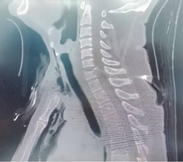 CT检查显示,射钉呈前后走向贯穿颈部正中,伤及气管与颈椎,合并纵隔气肿和肺挫裂伤。气管破损处出血易致误吸,危及生命;更严重的是,C7节段颈髓遭受贯穿损伤,伴随高位瘫痪,可能进一步影响呼吸与心跳功能。此外,钉道走向提示食管损伤风险极高。经创伤中心主任医师张鹏、副主任医师赵宝、主治医师赵之孟,耳鼻喉科副主任医师高昆、胸外科主治医师李猛等多学科专家会诊,迅速制定分阶段救治方案:先行气管切开缓解呼吸衰竭,再限期经颈后路行椎管清创减压及内固定术,以控制中枢感染风险。