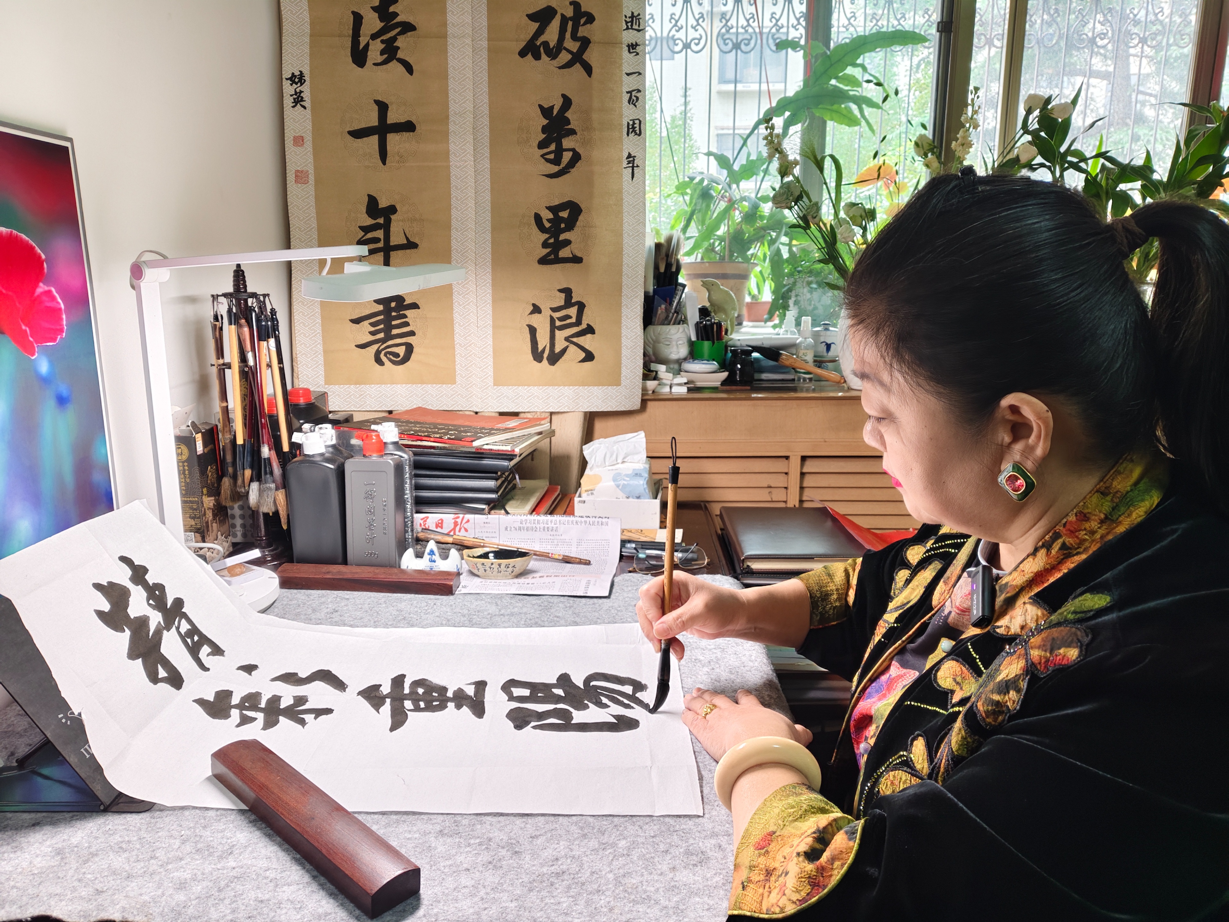 “也快重阳节了,就献丑写个‘精彩重阳’吧。”只见高妹英端坐在桌案前,将宣纸折叠出方正的格子,镇纸一推,笔墨一沾,笔走龙蛇间,大气浑然的“精彩重阳”四个大字跃然纸上。