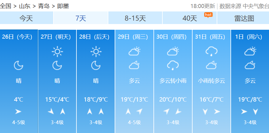 青岛以晴转多云天气为主,31日有小雨。气温起伏较大,最低气温沿海地区9~17℃,内陆地区3~16℃,27日和28日早晨前后,北部地区和山区局部有霜冻或轻霜冻,最高气温全市14~21℃。南北风交替,风力4级左右。