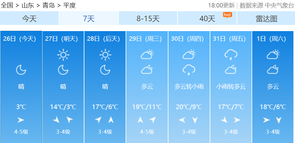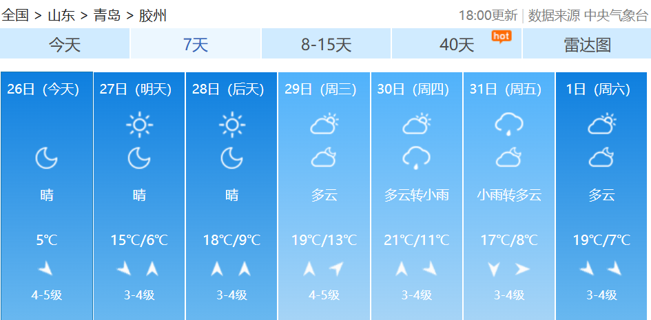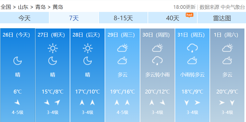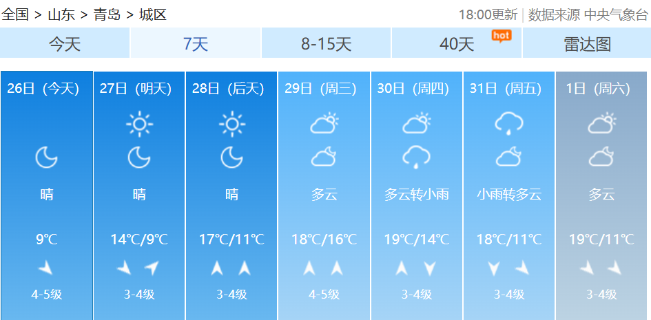 【青岛市区】27日白天,晴间多云,北风3到4级,相对湿度30%~80%,27日最低气温9℃,最高气温14℃。