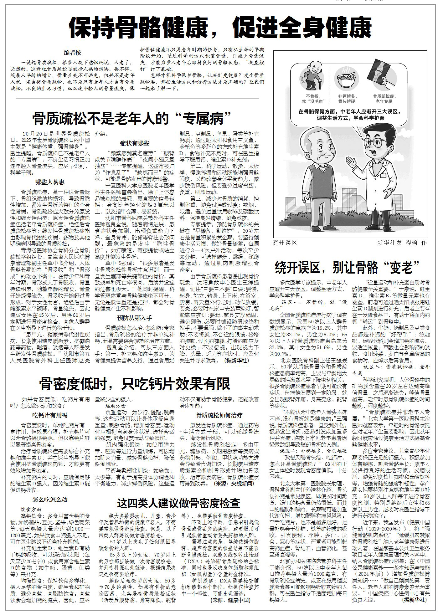 近年来,我国发布《健康中国行动(2019-2030年)》,将“强健骨骼肌肉系统”“延缓肌肉衰减和骨质疏松”纳入老年健康促进行动内容;在国家基本公共卫生服务项目老年人健康管理相关内容中,纳入骨质疏松症预防等;在《中国公民健康素养——基本知识与技能(2024年版)》增加骨质疏松健康知识……“做自己健康的第一责任人,老年人群的健康素养尤为重要。”中国疾控中心慢病中心有关负责人说。