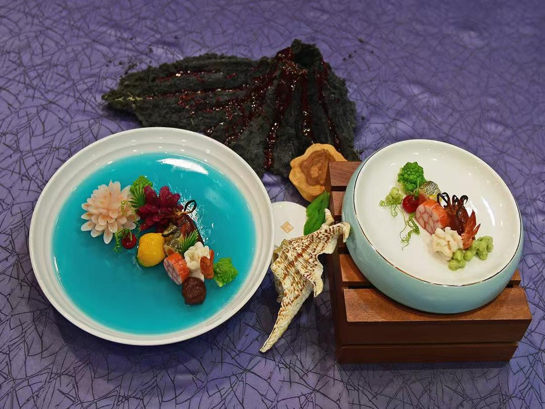 其他代表队也紧扣海洋主题各显神通:淄博代表队带来的“蝴蝶戏牡丹”选用卤水墨鱼、五彩卷尖、整只牡丹虾等原料拼成蝴蝶,以挪威三文鱼、青萝卜拼摆成一朵刚刚绽放的牡丹花。这道菜不仅颜值超高,寓意“花开富贵,喜上眉梢”,味道更是层次丰富,清爽适口。