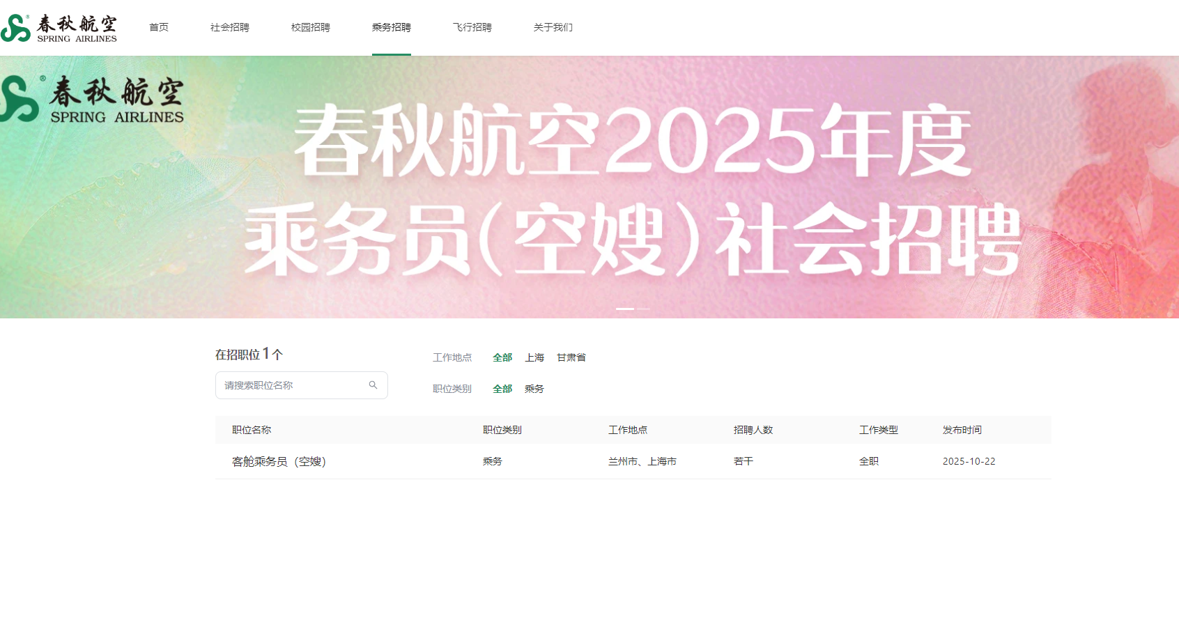 与此同时,春秋航空公司官网推出2025年度乘务员(空嫂)社会招聘页面,相关招聘信息显示,本次招聘的空嫂工作地点为兰州市、上海市。