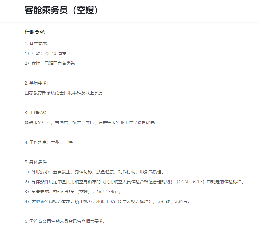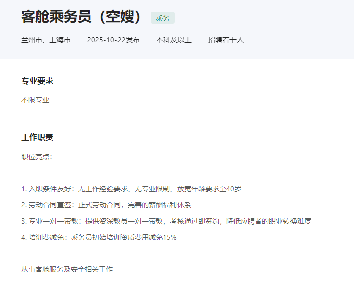 招聘信息显示,客舱乘务员(空嫂)招聘,已婚已育者优先,无工作经验要求、无专业限制、放宽年龄要求至40岁,从事客舱服务及安全相关工作。