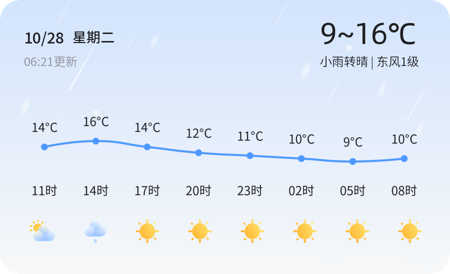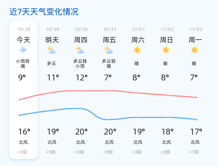 今天是10月28日,星期二,农历九月初八。泰安市今日天气为小雨转晴,气温介于9℃至16℃之间。各区普遍出现小雨天气,湿度较高,PM2.5指数为132,空气质量指数为轻度污染。市民出行需注意携带雨具,做好保暖措施。今日6时21分,泰安气温为7.6℃,东风1级,湿度为97%。