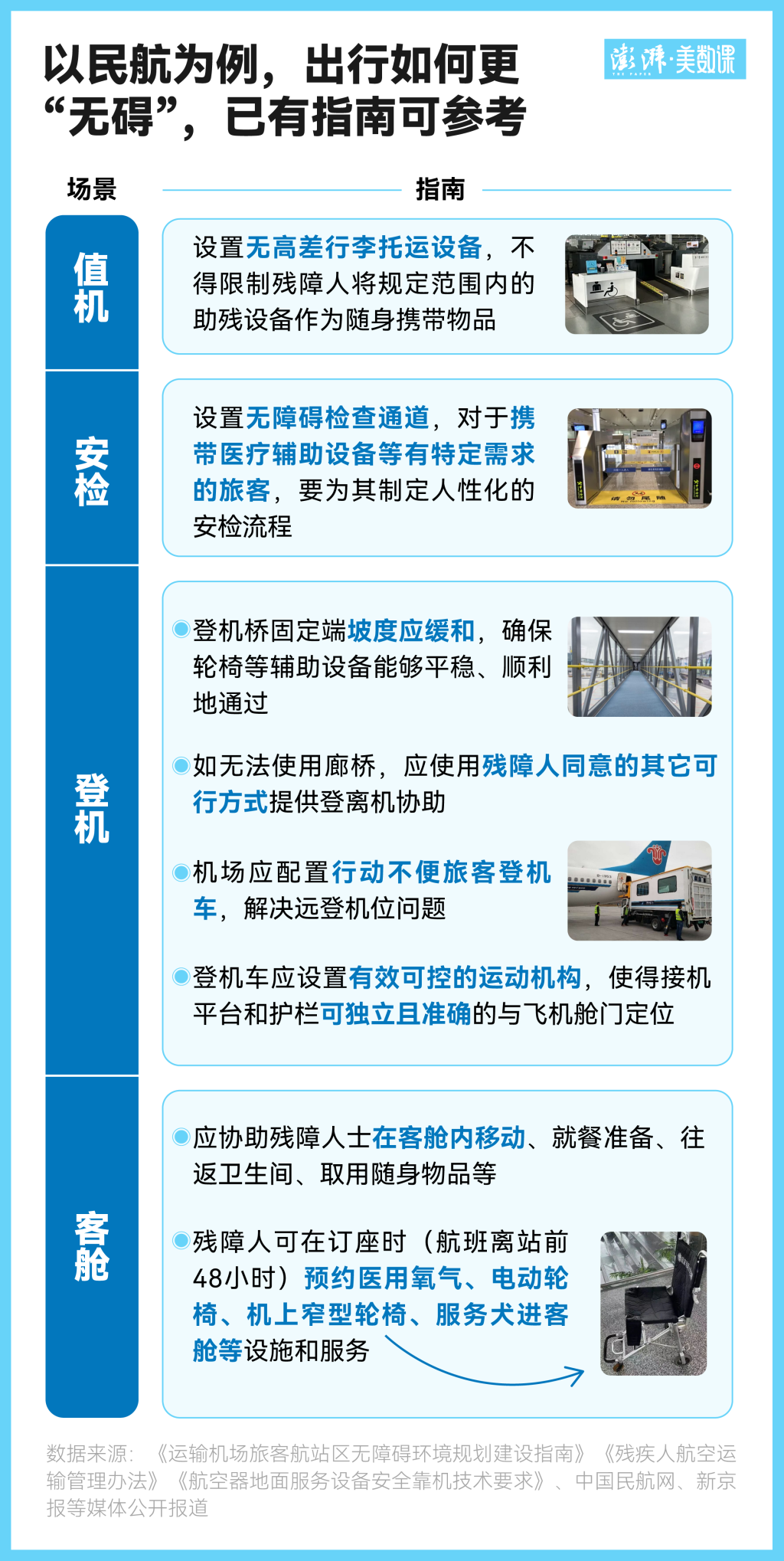 行业内则逐渐建立起更清晰、细致的参考标准。以此次事件中的民航业为例,民航局在今年5月发布了《运输机场旅客航站区无障碍环境规划建设指南》,对从进入机场到登机的全流程均设立了详细的无障碍设施参考标准;《残疾人航空运输管理办法》也规定了航空承运人应当为残疾人提供的设施和服务。
