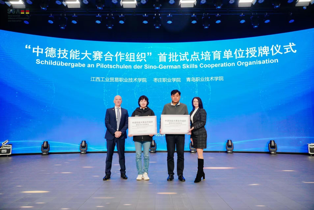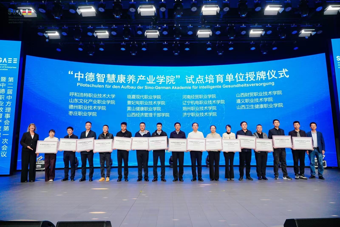 本次大会以“深化中德职教合作、赋能区域经济发展”为核心,同期举办职业教育高质量发展成果展、德国师资培训、中德合作项目洽谈会及企业考察等活动,汇聚中德两国政府官员、职教专家、行业领袖及院校代表,共商职业教育高质量发展路径。会上,学院凭借在中德职教合作、康养人才培育及数智领域产教融合的扎实实践,成功斩获“中德技能大赛合作组织首批试点培育单位”“少年工匠学院试点培育单位”“中德智慧康养产业学院试点培育单位”和“全国数智康养行业产教融合共同体理事单位”四项重要资质。
