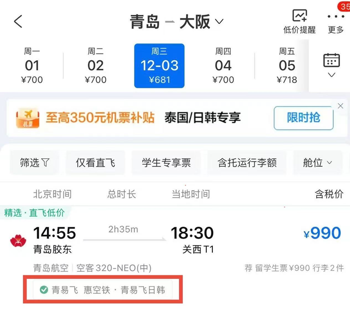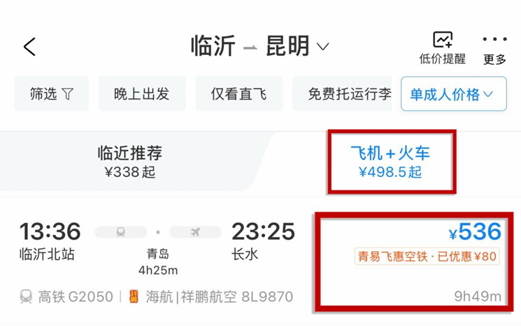 即日起至2025年12月31日,青岛机场“青易飞 惠空铁”系列空铁联运福利持续放送,当日乘高铁来青岛机场搭乘国内及国际(含地区)航班出行的旅客(始发及到达城市具体站点),在实现“一次购票、一次支付”的同时,可享受高铁/动车二等座/城际票价最高直减80元优惠,往返均适用。旅客只需在携程APP机票频道输入高铁出发城市与航班最终目的地,系统将自动推荐包含“飞机+火车”的联运方案,选择并认准带有“青易飞 惠空铁”专属标识的班次,其显示价格即为已立减后的优惠价格。(温馨提示:高铁班次及中转航线持续更新,数量有限,请以携程实时查询为准。)