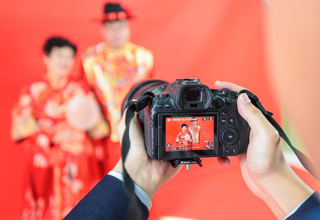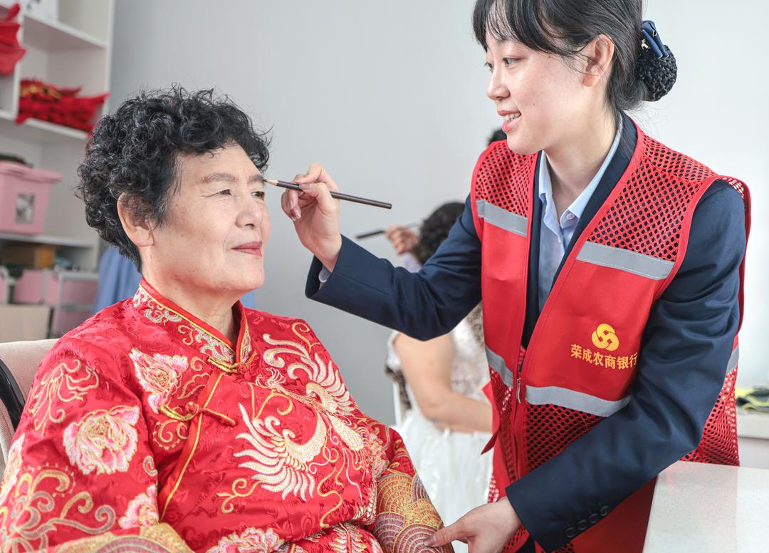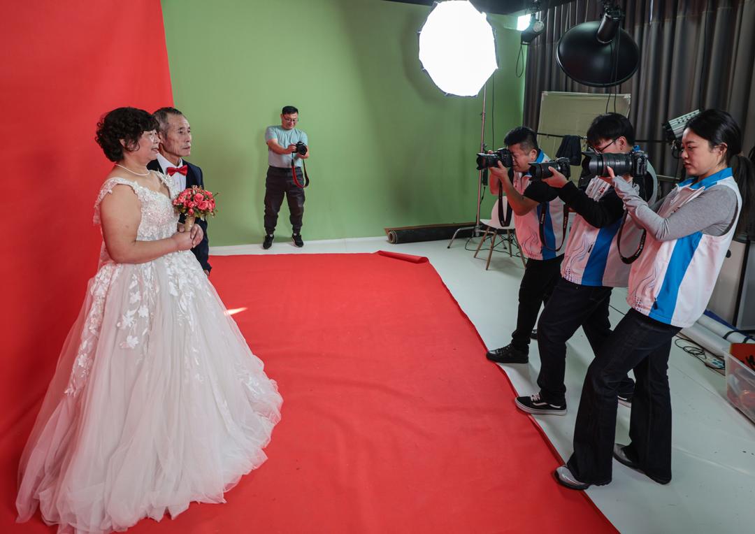 10月28日,在荣成市新时代文明实践中心摄影棚内,一场以“金婚迎重阳 美好家风永传承”为主题的新时代文明实践活动温馨举行。志愿者们为金婚老人拍摄婚纱照,用镜头记录他们相濡以沫五十载的幸福。